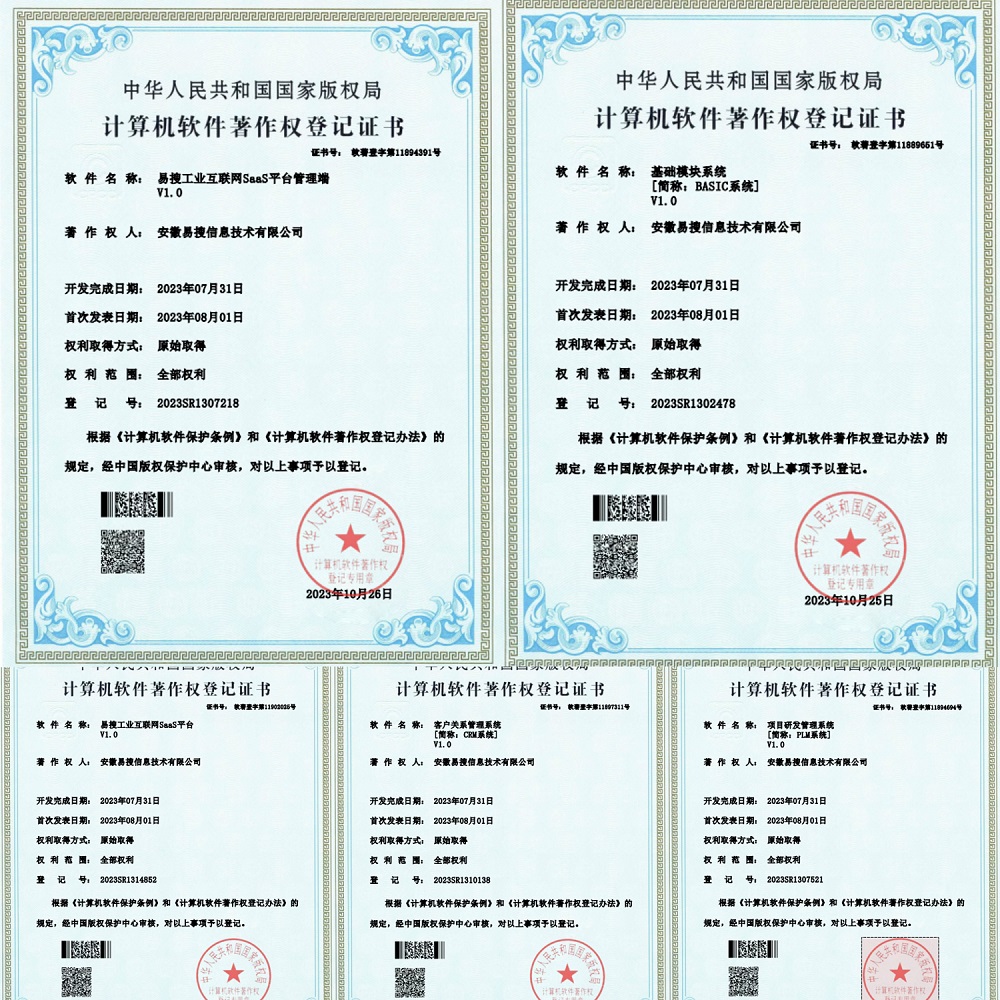 有關(guān)易搜工業(yè)互聯(lián)網(wǎng)SaaS平臺申報的5項計算機軟件著作權(quán):易搜工業(yè)互聯(lián)網(wǎng)SaaS平臺、易搜工業(yè)互聯(lián)網(wǎng)SaaS平臺管理端、基礎(chǔ)模塊系統(tǒng)、客戶關(guān)系管理系統(tǒng)、項目研發(fā)管理系統(tǒng),已經(jīng)成功通過申請,相關(guān)證書已發(fā)放。后續(xù)還將進行科技成果登記,爭取獲得相關(guān)證書。